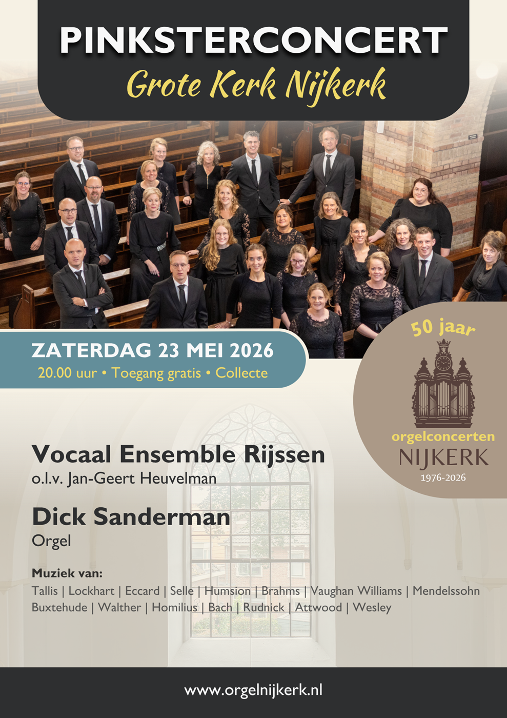 Het Pinksterconcert markeert jaarlijks de start van de concertserie die de orgelcommissie van de Grote Kerk in Nijkerk organiseert. Dit jaar verzorgt het Vocaal Ensemble Rijssen deze bijzondere avond, waarop klassieke (kerk)muziek uit verschillende stijlen en tijden samenkomt.